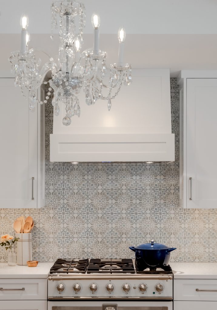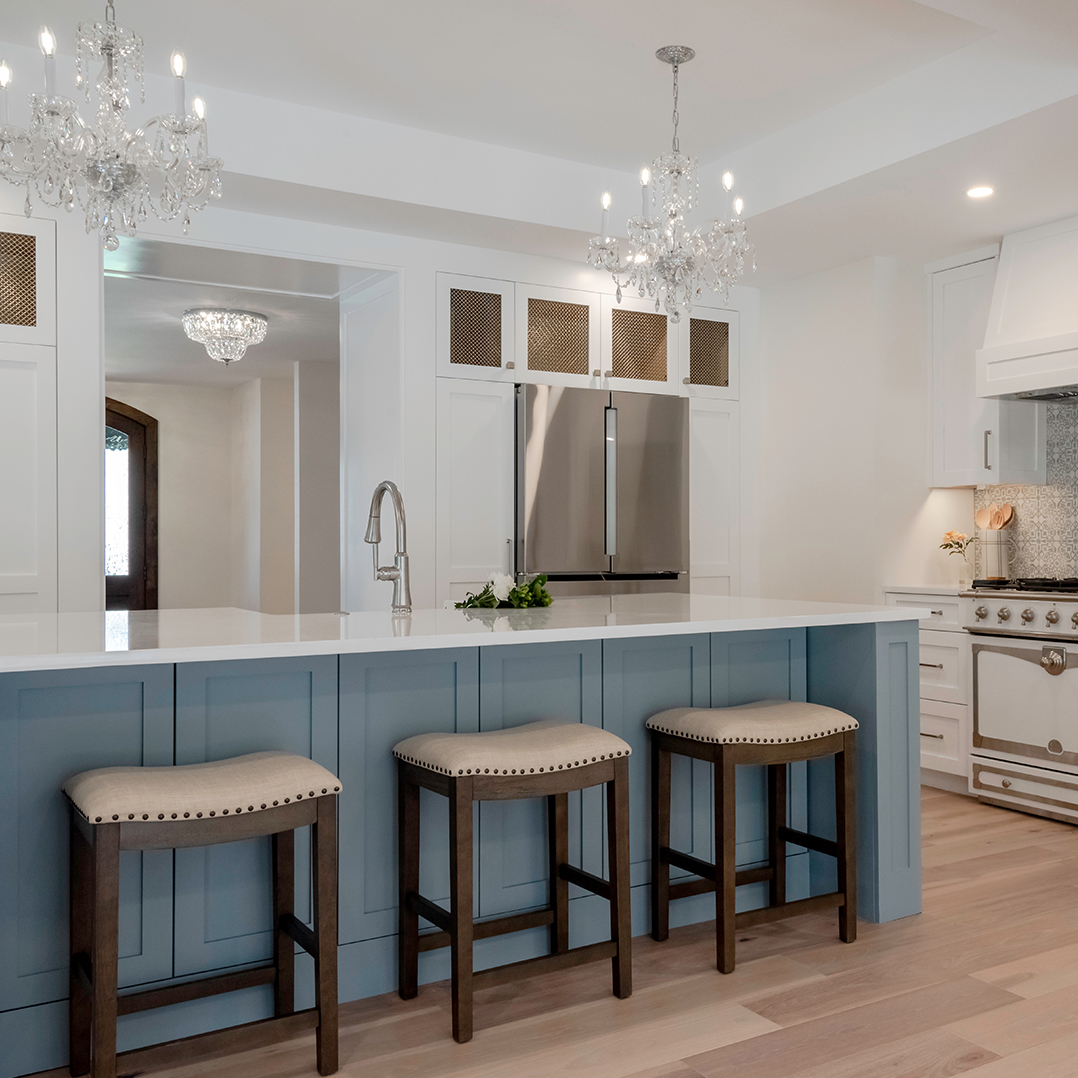 • Widened the tray ceiling above the impressive new island to accommodate breathtaking crystal chandeliers
