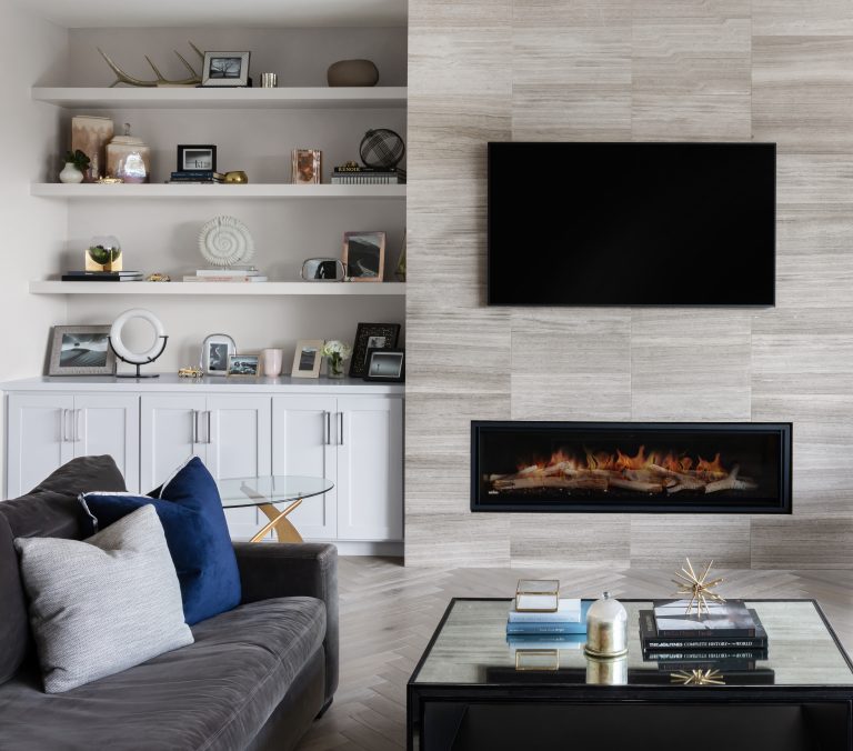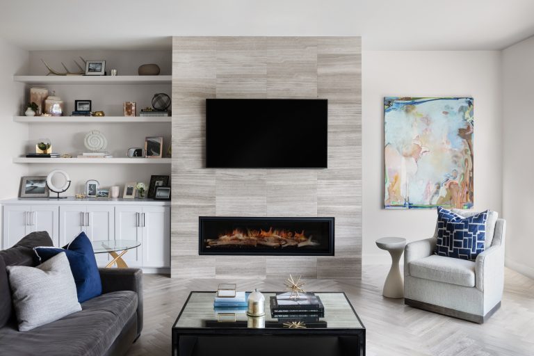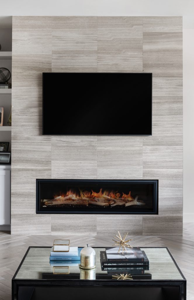 • 62” linear gas fireplace with floor-to-ceiling tile surround.