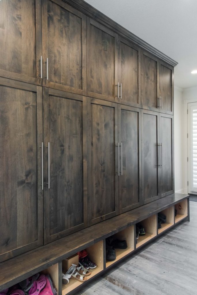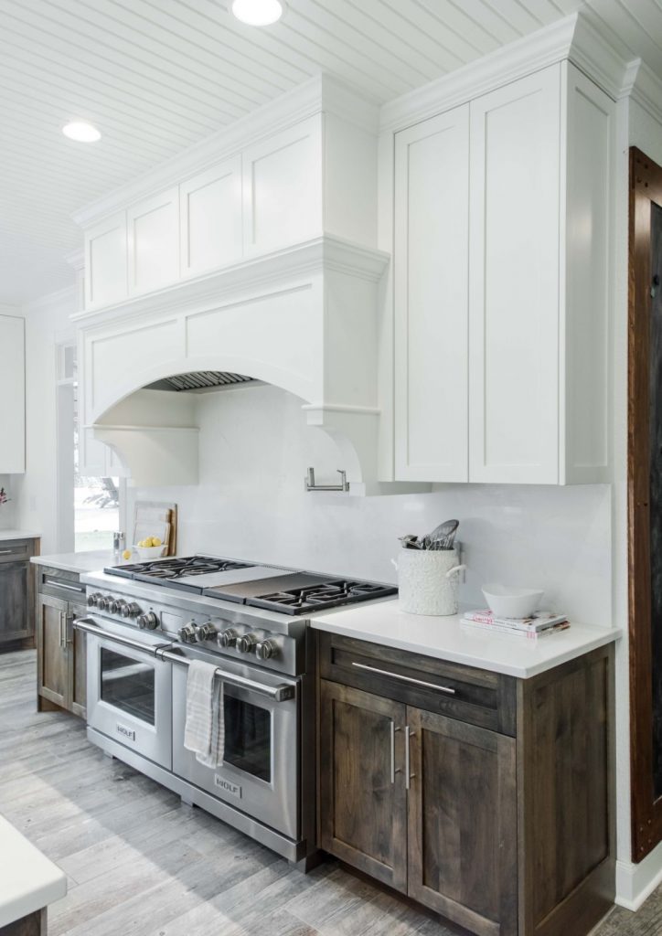 • Custom stained and painted wood cabinetry with crown moulding details and wood vent hood surround with a stainless steel vent liner.