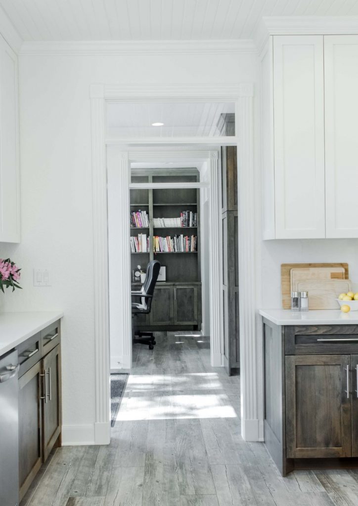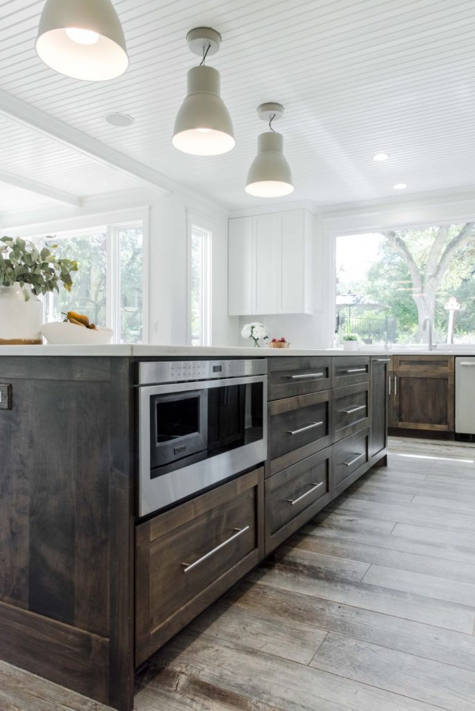 • Wood-looking porcelain plank tile flooring throughout the kitchen.