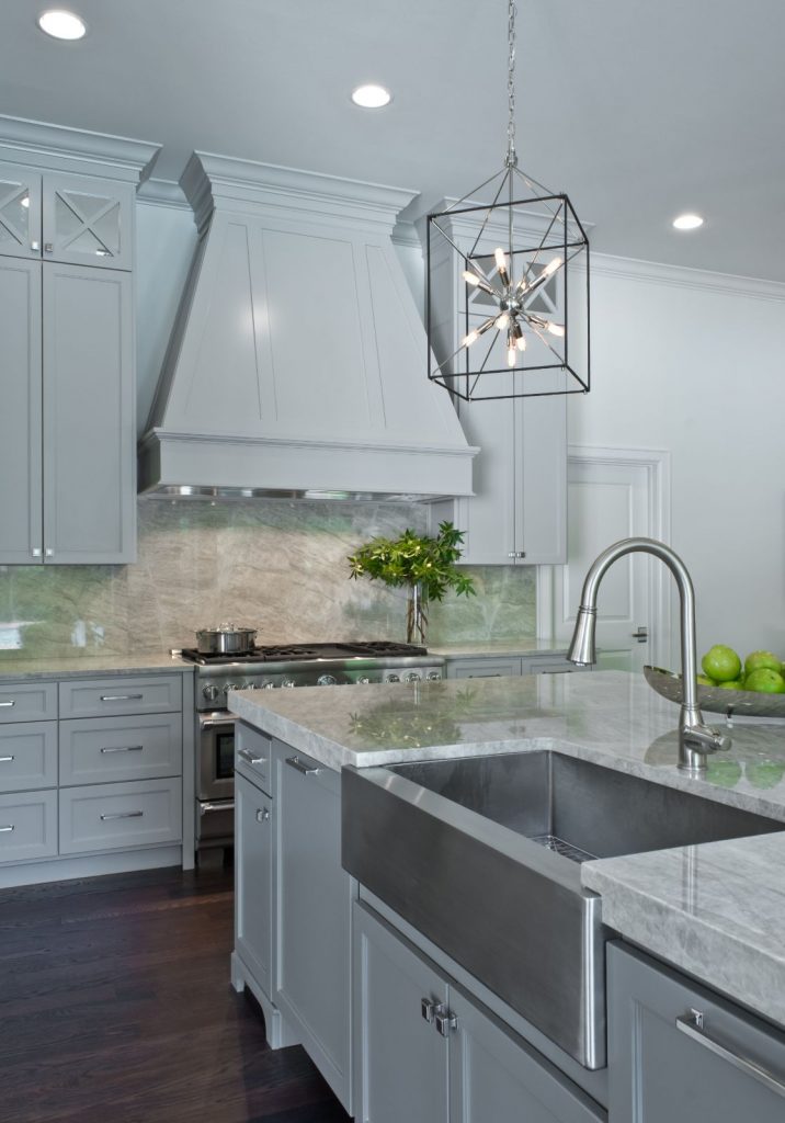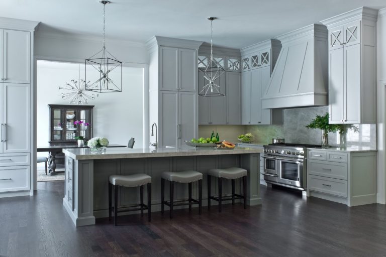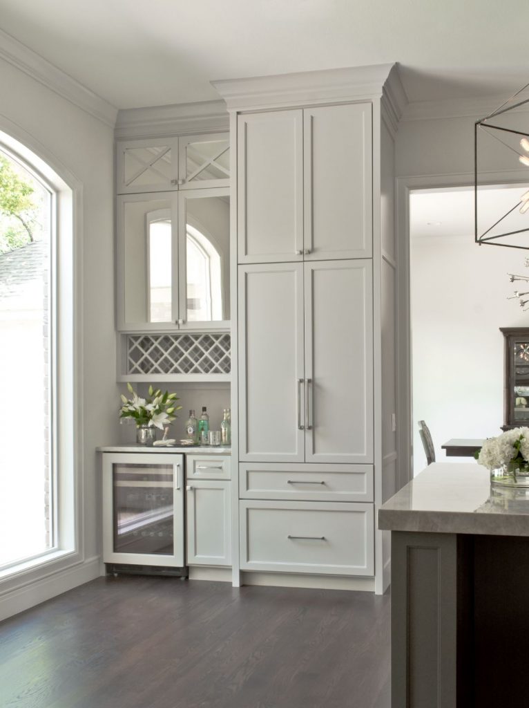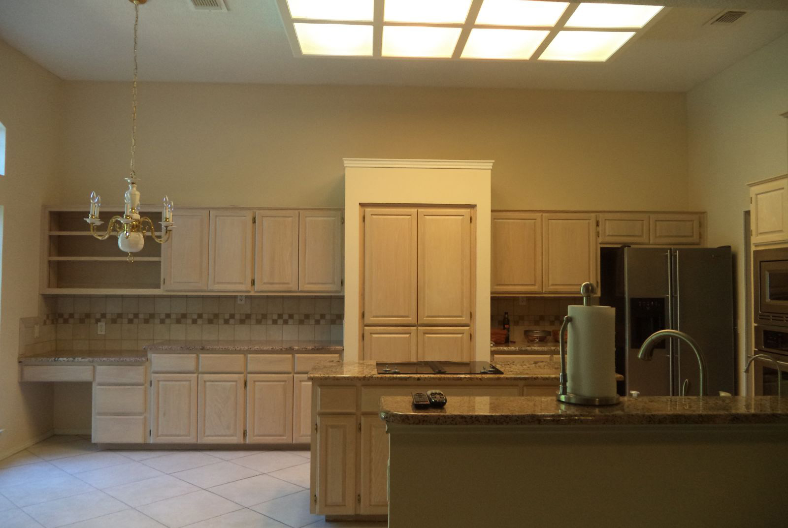 • 10’ ceilings with custom wood paint grade cabinetry and vent hood.