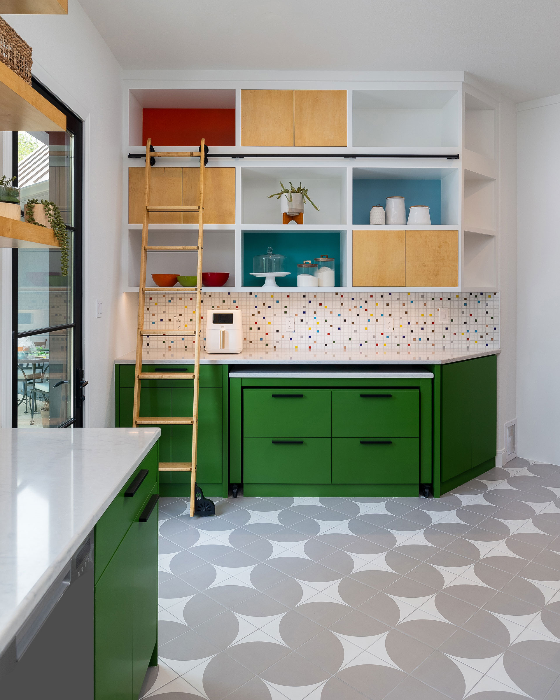• Bold, playful cabinet colors paired with textured TileBar flooring and Mod Walls accent tiles bring energy and personality.